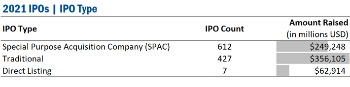Building on recent trends, special purpose acquisition companies (SPACs) led the way with more than 600 IPOs during 2021. But traditional IPOs also had a big year with more than 400 transactions and direct listings grew from just three in 2020 to seven in 2021.