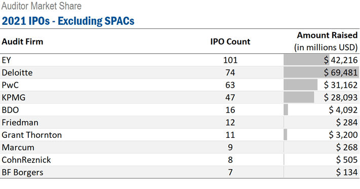 Excluding SPACs, the Big Four firms were engaged by two-thirds of IPOs. EY was engaged by the most clients with 23% of non-SPAC IPOs. Deloitte’s non-SPAC clients raised the most with nearly $70 billion.