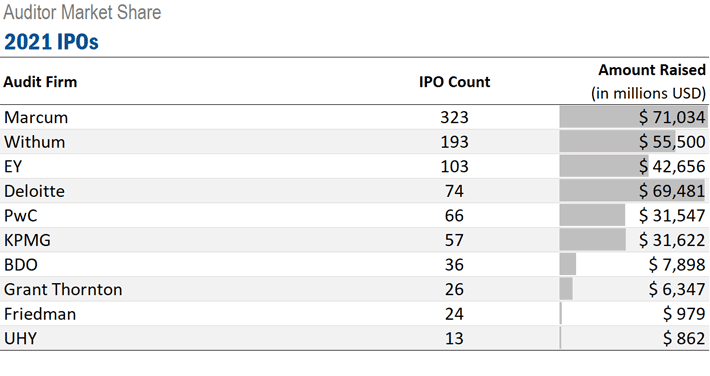 Once again, Marcum and Withum were the top two audit firms of IPOs. Together, these two firms audited nearly 50% of 2021 IPOs. Marcum audited 323 IPO clients, 314 of which were SPACs. Withum audited 193 IPO clients, 192 of which were SPACs.