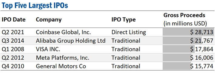 Coinbase Global, Inc. [COIN] led the way in terms of gross proceeds by raising $28.7 billion from its Q2 2021 IPO. The Coinbase IPO outraised the previous largest IPO – Alibaba Group [BABA] – which IPO'd in 2014. In total, 38 companies raised $1 billion or more in 2021. Six of the seven direct listings, 28 traditional IPOs and 4 SPACs raised $1 billion or more during 2021.