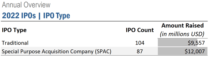 Unlike in 2021, traditional IPOs outnumbered special purpose acquisition companies (SPACs) in 2022. Traditional listings raised an average of $91.9 million per IPO while SPACs averaged $138 million per listing.