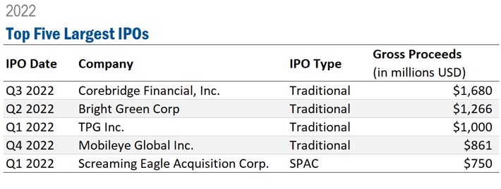 Corebridge Financial, Inc. was the largest IPO in 2022 in terms of gross proceeds, raising $1.68 billion from its September 2022 listing. Only two other IPOs broke the billion-dollar barrier in 2022. Although SPACs had a higher average amount raised per IPO, four of the top five IPOs in 2022 were traditional listings.