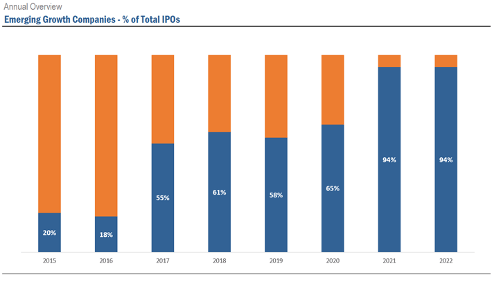 Continuing the upward trend that began in 2017, the percentage of companies that identify as emerging growth companies (EGCs) remained high in 2022. Just as in 2021, 94% of all IPOs claimed EGC status in 2022.
