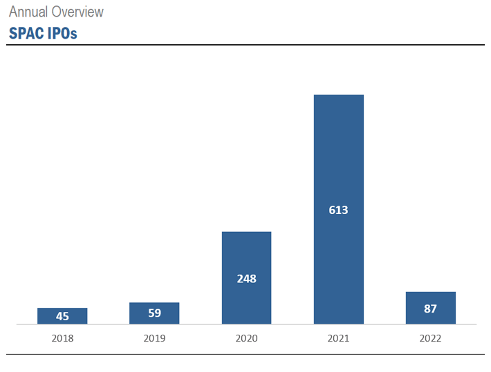 The number of SPAC IPOs has spiked significantly over the past two years. The fiscal year (FY) 2020 saw a 320% increase in SPAC IPOs, followed by another 147% increase in FY 2021. However, in 2022 SPAC IPOs decreased for the first time over the five-year period, dropping 85.8% from FY 2021.
