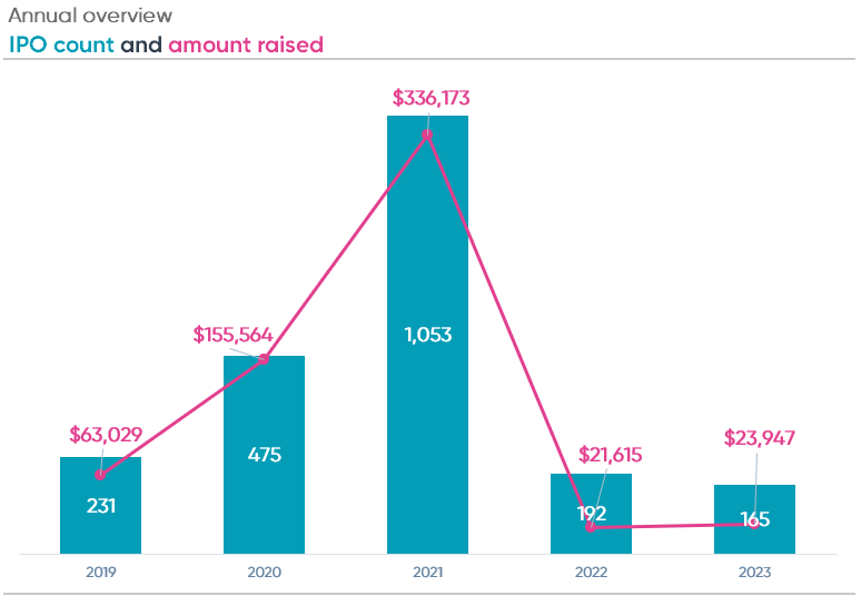 Initial public offerings (IPOs) saw a five year low in 2023 with only 165 new listings during the year. Together, these companies raised $23.9 billion, an average of $145 million per offering. Compared to 2022, IPOs decreased by 14% while total proceeds raised increased 11% showing that while there were fewer companies listing, the size of the listings were greater.