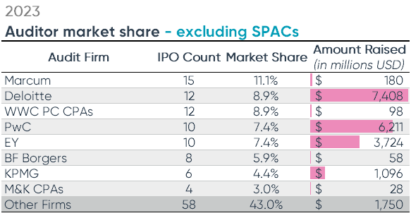 In total, 46 different firms audited the 135 IPOs, excluding SPACs, completed in 2023.