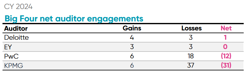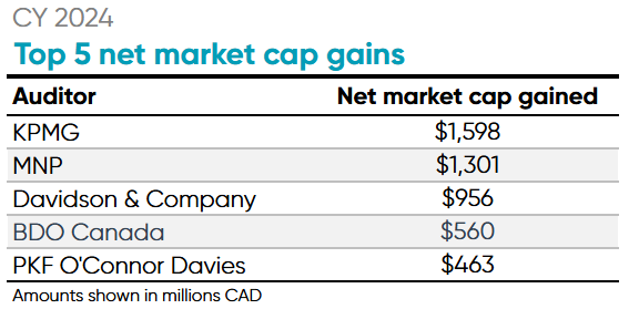 Overall the Big Four underperformed in 2024 in the Canadian market. The firms experienced 19 engagements and 61 departures collectively. KPMG saw the most dramatic loss of clients with 31 net client losses. Although KPMG lost the most clients, the majority of the departures were firms with market capitalization below CAD $100 million. The largest client lost was Cronos Group Inc., a global cannabinoid company based in Toronto, whose market cap was CAD $1.28 billion.