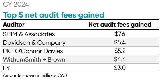 SHIM & Associates, a Vancouver-based auditor, led all firms in net audit fees gained with CAD $7.6 million, two million more than the next firm, Davidson & Company. SHIM & Associates has 45 clients in Canada. Davidson & Company, who placed second in the ranking for net audit fees gained, gained CAD $5.4 million in net fees. Cronos Group, who Davidson won from KPMG, was the largest client gained in terms of fees. Cronos paid CAD $2.67 million in audit fees in 2023.