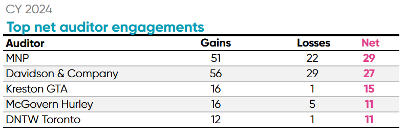 Davidson & Company was the leading auditor for total new engagements among Canadian auditor changes in 2024. Davidson engaged 56 new clients throughout the year. Despite engaging the most new clients for 2024, Davidson trailed in net auditor engagements to rival firm MNP who had a total of 29 net engagements.