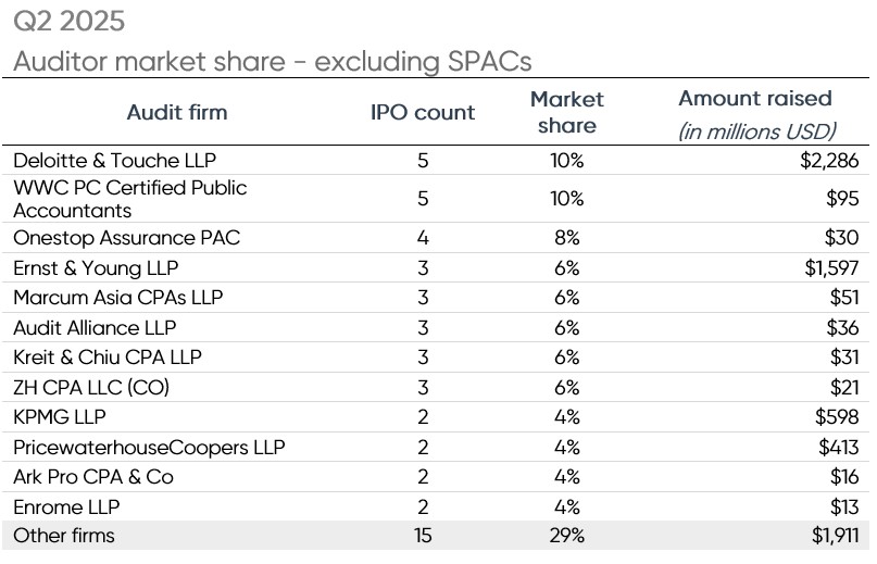 Deloitte led the audits of non-SPAC IPOs at 5 IPOs for 10% of the market. WWC followed with 10% of the market share, also at 5 IPOs.