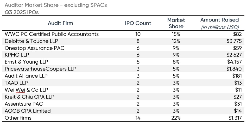 There were 31 different firms that audited the newly listed companies in Q3 2025. WithumSmith + Brown again led all auditors in terms of total IPO client count with 20 new IPO clients. Withum individually represented 20% of all Q3 2025 IPOs. WWC PC Certified Public Accountants trailed Withum with 11 IPOs audited, while big four member Deloitte was third with eight IPOs.
