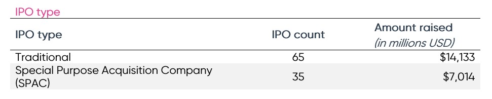 Special Purpose Acquisition Companies (SPACs) represented 35% of total IPOs in Q3 with a total of 35 new offerings. Compared to last quarter, SPAC IPOs decreased by 20% while traditional IPOs increased by 27%.