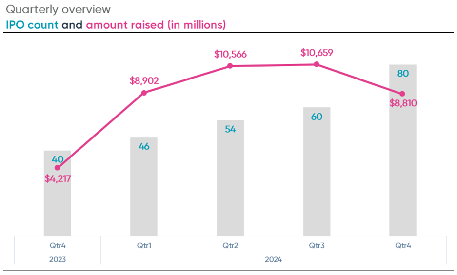 In the fourth quarter of 2024 there were 80 new initial public offerings (IPOs), which raised a combined total of $8.8 billion. Despite total IPOs increasing by 33% from the previous quarter and reaching a high point for the year, total gross proceeds decreased by 17% in Q4, the smallest combined gross proceeds of any quarter in 2024. The increase in IPOs and corresponding decrease in gross proceeds indicates that average gross proceeds for IPOs for the fourth quarter were much lower than previous quarters.