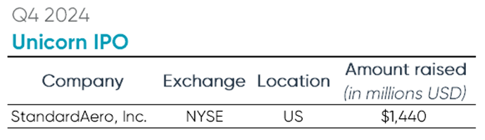During Q4 2024, there was only one company that raised over $1 billion in proceeds from its public offering. The third largest IPO of the year in terms of proceeds, StandardAero, Inc. raised $1.44 billion. StandardAero is an aircraft maintenance service provider with clients including GE Aerospace, Rolls-Royce and Southwest Airlines. The company priced its IPO at $24 per share, which was higher than the initial targeted range of $20-23. StandardAero, Inc. trades on the New York Stock Exchange.