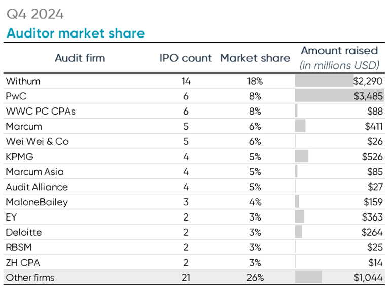 In Q4, PwC ranked number one in terms of client gross proceeds. PwC’s six clients raised a total of $3.49 billion in gross proceeds and was the auditor of record for StandardAero, Inc., the largest IPO of the quarter. Withum followed PwC with a total of $2.29 billion in IPO client proceeds, nearly identical to last quarter's figure at $2.27 billion.