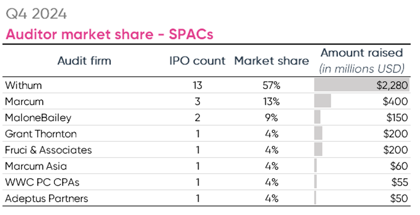 Eight firms audited the 23 SPAC IPOs of Q3 2024. Withum was the dominant player in the SPAC IPO market, auditing 13 SPAC IPOs this quarter after auditing 11 of the 18 SPACs in Q3. All but one of Withum’s 14 total IPO clients in Q3 2024 were SPACs and raised a combined total of $2.28 billion in proceeds. Withum accounted for 57% of the SPAC IPO market share this quarter. Marcum audited three SPAC IPOs in Q4 with total gross proceeds of $400 million, up from $50 million in gross proceeds for Q3.