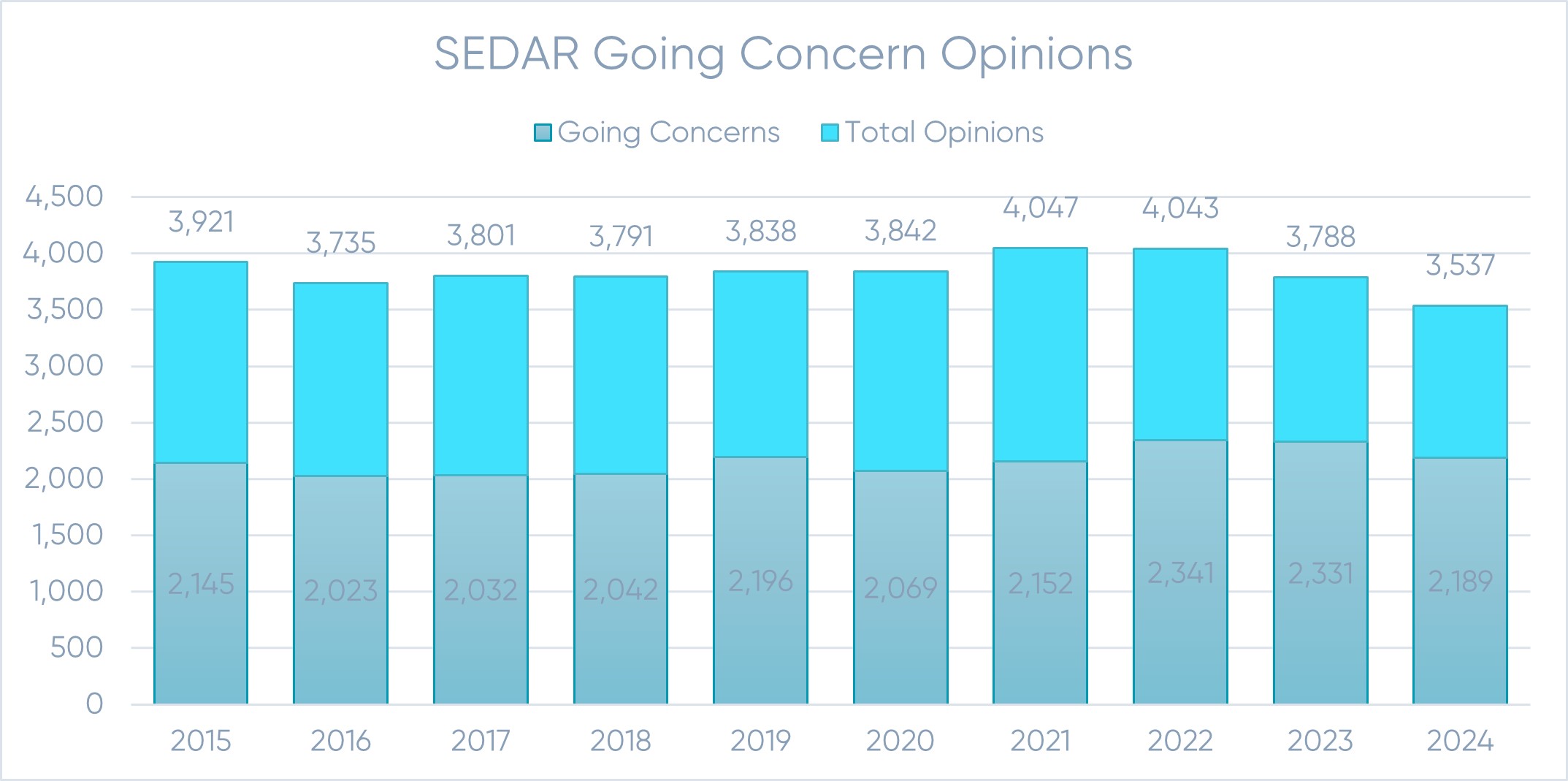 The number of SEDAR registered companies that received a going concern decreased by 6% during FY2024 to 2,189 companies. Total opinions also declined by 6% in FY2024.