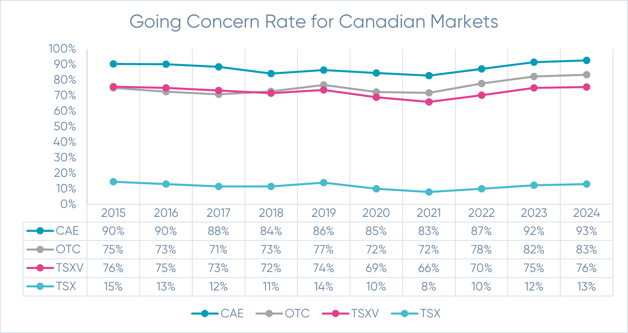The associated going concern rates are below. The high level of going concern on the Canadian stock exchanges is primarily linked to their resource-based economy, with a significant proportion of companies in the mining and oil and gas industries   These extractive industries require substantial upfront investment and long lead times to revenue and positive operating cash flows.  Even for established companies with proven reserves and production, the volatile nature of commodity prices can increase liquidity risks.